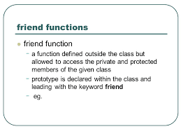A friend can be a function function template or member function or a class or class template in which case the entire class and all of its members are friends. Following are some important points about friend functions and classes.
